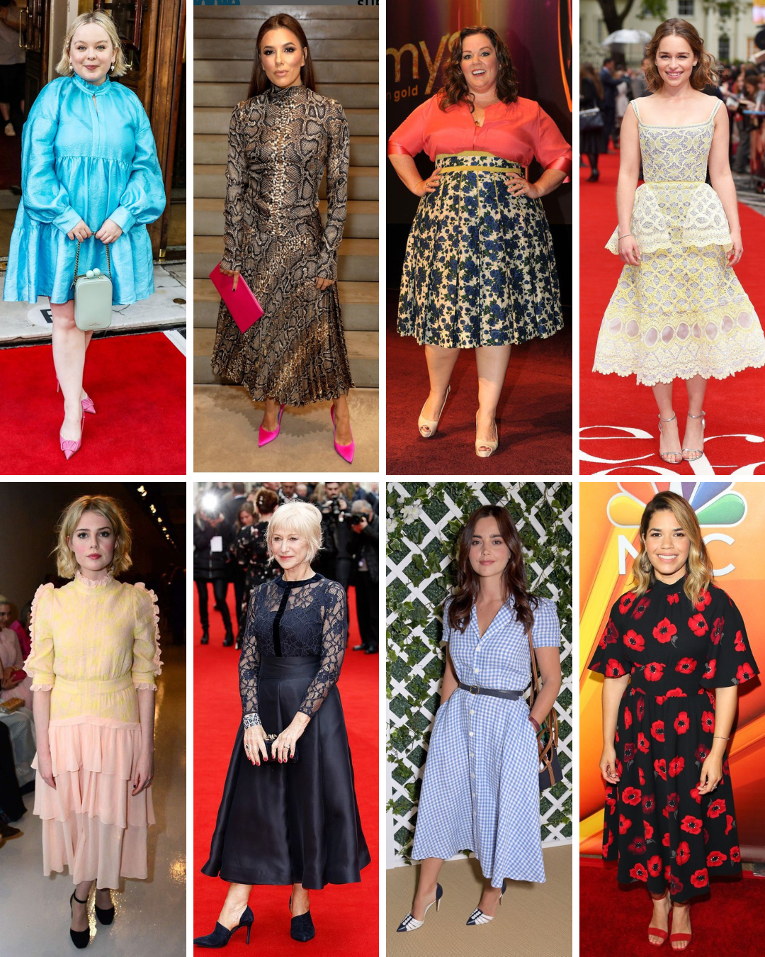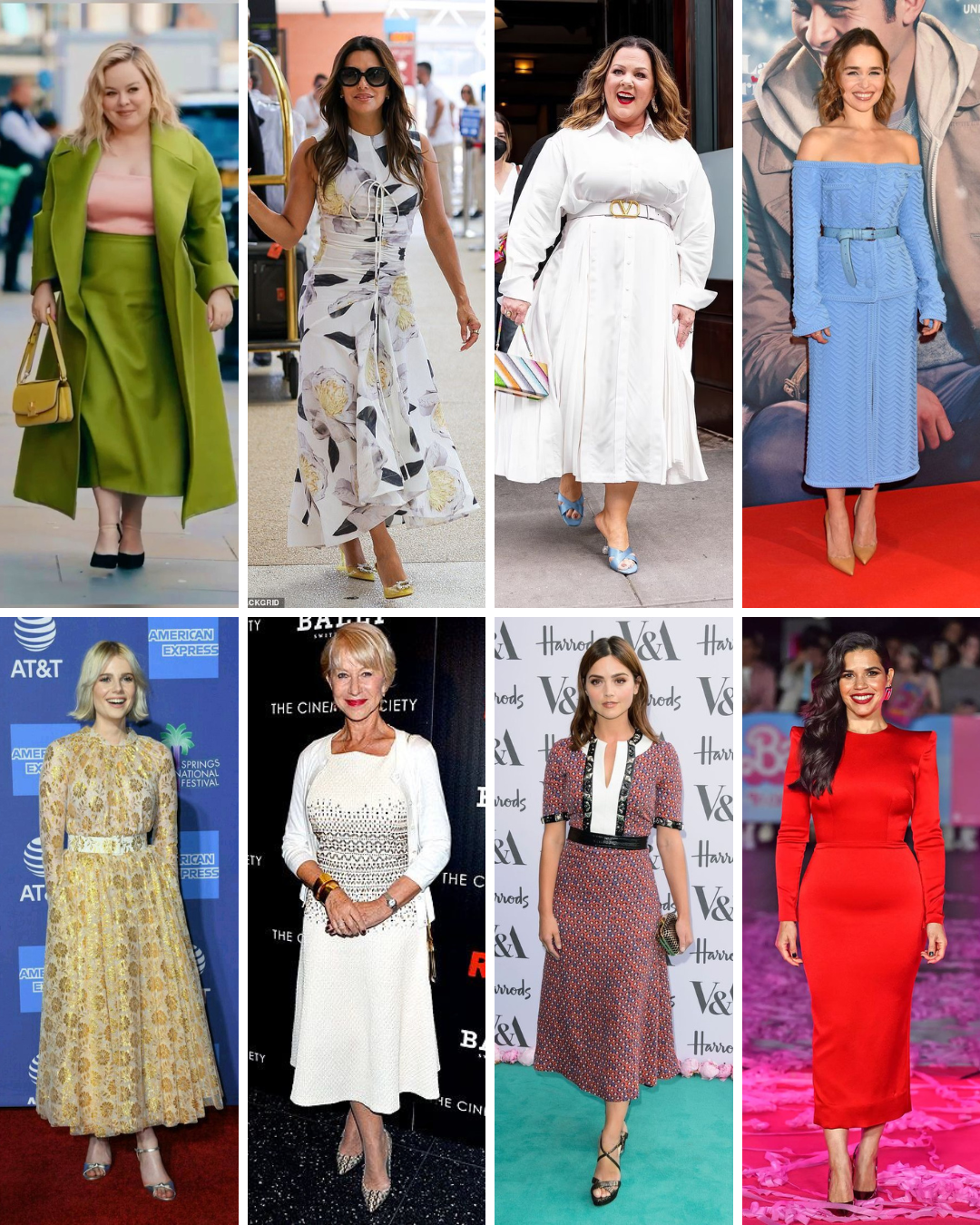 Petite celebrities such as Nicola Coughlan (5’1”), Emilia Clarke (5’2”), Jenna Coleman (5’2”), America Ferrera (5’1”), Eva Longoria (5’0”), Melissa McCarthy (5’2”), Jennifer Lopez (5’4”) and Helen Mirren (5’4”) regularly wear midi-length dresses in ways that feel balanced and intentional.